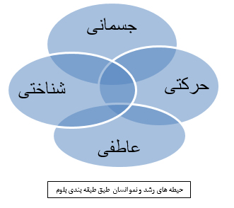 همان گونه که در شکل پیداسترشد و نمو انسان دارای چهار حیطه ی در هم تنیده جسمانی، حرکتی، شناختی و عاطفی است، که رشد و نمو هر حیطه در تعامل و وابستگی با حیطه های دیگر است و نقص در رشد هر حیطه می تواند تاثیر منفی بر حیطه های دیگر بگذارد. چون بحث این مقاله در مورد رشد حرکتی است از پرداختن به حیطه های دیگر می پرهیزیم، البته این نکته گفتنی است که با توجه به طبقه بندی بلوم رشد حرکتی از رشد جسمانی متمایز استیعنی اگر فردی در ظاهر، جسمی سالم و کامل داشته باشد نمی توان گفت این فرد از نظر حرکتی هم هیچ مشکلی ندارد و به کمال رشد حرکتی خود رسیده است.